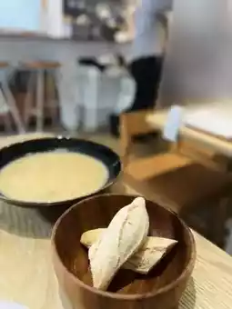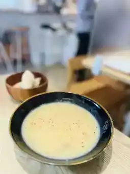 Very large bowl, cream soup with mashed potatoes, mussels. Served with crispy bread and hot enough.