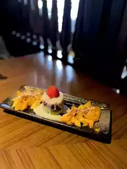 A portion of three pieces, Taco fresh crab meat enough, a little spicy, with salad dressing, cherry tomatoes, very tasty 😋
