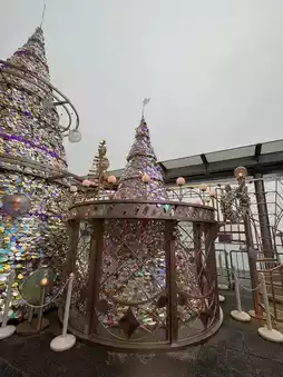 There are a dozen Christmas trees hanging in the air or spread out on either side