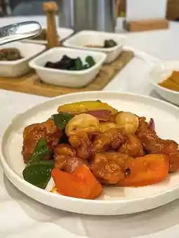 The pineapple sweet and sour pork variation, the sweet and sour pork is excellently done, fluffy and delicious, the lychee meat is sweet and clear, it is a good accompaniment.
