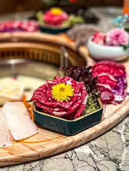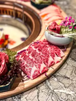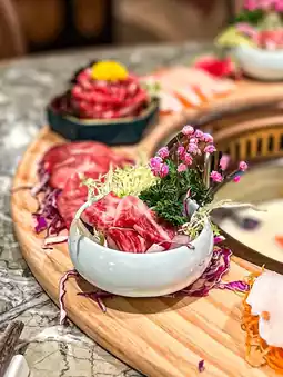 This whole beef platter includes hand-cut fat beef, beef fillet, Angus fat beef, beef calf, beef white meat, beef heart top, black cypress leaves and beef tongue