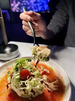 The food was surprisingly good 😆, in fact, I did not have any expectations, because I just wanted to take pictures of jellyfish 😆😆😆 I ordered a soup and two main courses 🐗 Super love crab meat Spanish cold soup 💓 added avocado, smooth tomato soup rich taste very appetizing