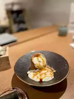 Baked crispy bean curd skin wrapped in rich soy milk ice cream, quite smooth and heavy bean flavor 🖤, the bottom layer is used with fried germ crispy with white chocolate crumbs to match, then sprinkled with soy sauce black sugar sauce, with gold foil ✨ decoration. The whole taste is rich and sweet, with rich layers of palate, and the presentation is quite exquisite.