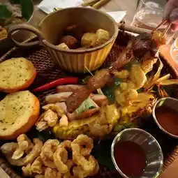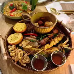 The snack platter was rich with pandan leaf wrapped chicken, cheese garlic bun, fried pork skin, skewers, chicken dates and Chiang Mai sausage, the day pandan leaf wrapped chicken, replaced by pork neck. The pork neck meat is crispy. You can choose any 2 kinds of skewers from chicken, beef and pork. The chicken and pork skewers are grilled to a fragrant aroma, and they are served with sand sauce, which tastes good. The granular chicken dates and Chiang Mai sausage, one bite at a time, dipped in sweet and sour sauce, extra delicious. The cheese garlic bread and fried a pork skin are crispy and delicious, best to share with friends though.