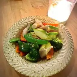 The garlic stir-fried mixed vegetables, including honey beans, broccoli, shiitake mushrooms, green peppers and carrots, are fresh and sweet.
