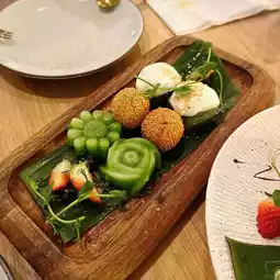 The Thai classic pastry platter is eye-catching with 3 different desserts, including coconut sago cake, mottled layer cake and pan-fried dumplings. The coconut sago cake is slightly sweet and soft. The warm mottled layer cake is sweet and bouncy, and the fragrance is outstanding. The small pancakes are fried to a golden and crispy outer layer, while the inside is smooth and soft. The filling of salted egg and cream is unforgettable.