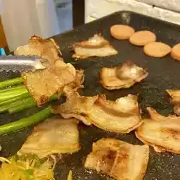On the grill board put thinly sliced frozen pork, sprouts, onion, kimchi, etc. together grill, especially the roasted oil, can eat the unique taste of frozen pork 👍🏻 entrance actually can not eat the frozen taste, each piece of fat and thin evenly, I like to add spicy sauce, green chili, garlic slices together to wrap lettuce eat, happiness Double Up☺️