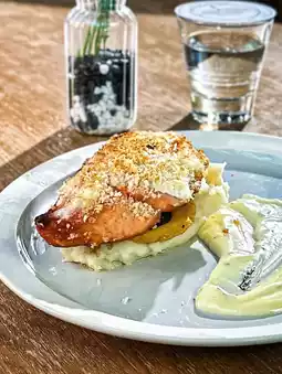 Burger cloud pastry is a traditional way of baking lamb chops in the south of France, and the restaurant uses salmon fillets; salmon fillets are covered with breadcrumbs and vanilla butter, crispy outside, tender inside, dipping sauce and eating very tasty 😌 Another lower part has mashed potatoes, taste good!
