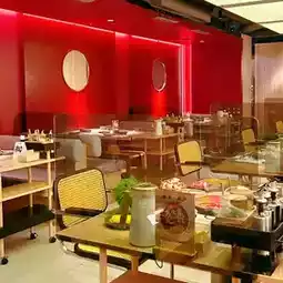 The restaurant has a simple design with dark red as the main color and soft lighting, which makes it feel comfortable and relaxing.