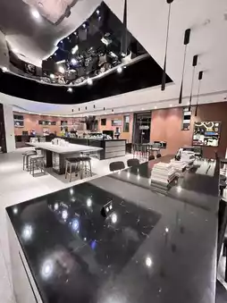 With black and white minimalist colors and lines, with characteristic concrete walls, a modern mixed industrial style.