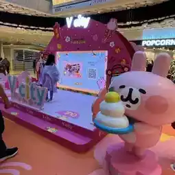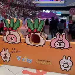 When I came to the V city atrium, I saw that there would be a big peach blossom in the middle, P assistant very sweetly hugging the pink bunny, behind the stage has a screen, I saw many children playing interactive games, on both sides there will be pink bunny photo spots, respectively holding small pastries and hearts, very cute