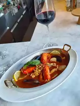 Spicy seafood and tomato combo, plus a glass of Italian red wine! Sigh!