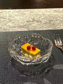Dessert is mango cheesecake, which is rich in mango and cheese flavor.