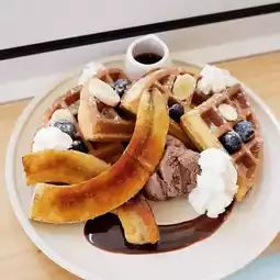 The ready-to-eat waffles are crispy on the outside and soft on the inside 🧇 Served with chocolate ice cream, caramel banana and seasonal fruit