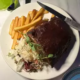 The pork ribs are grilled very crispy, tender meat, quite rich in meat, plus the special barbecue sauce, reminiscent, and fresh mixed vegetables and crispy inside and soft fries, delicious and satisfying!