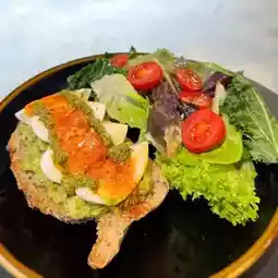 The avocado is smooth and served with half-cooked poached eggs and pesto sauce. This combination is fresh and healthyπ€©