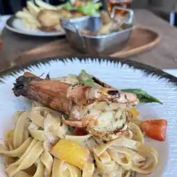 The spaghetti is smoky and chewy and has a good mouthfeel! The top is paired with two thick-fleshed tiger prawns, very eye-catching! Because of Southeast Asia