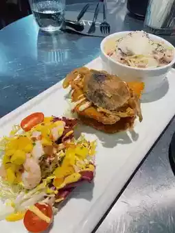 This is really filling🥳, fresh mango salsa shrimp salad, black truffle pork chop, spring egg carbonara pasta, fried soft shell crab, satisfy your salad, fried, pasta desires at once😋!