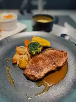 Big steak 🥩, just the right heat! Optional potatoes/spaghetti ~ This time my friend chose potatoes, but it should be better with spaghetti 🍝!