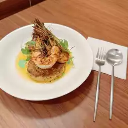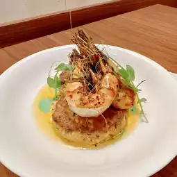 The presentation is impressive. The two tiger prawns are large, shelled, and easy to eat. The tiger prawns are fresh and crisp, and after pan-frying, they are fragrant and delicious. Beneath the tiger prawns are two crab cakes, each generously sized and full of flavor. The lightly spicy wasabi mayonnaise accompanies the dish, adding to the presentation. This dish has a strong flavor and is recommended for pairing with the tiger prawns or pasta.