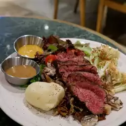 The shopkeeper recommended our order 50% cooked, I think it's just right, the beef flavor is rich, the accompaniment is rich with mashed potatoes, wild mushrooms and mixed vegetables, the taste is good 😊