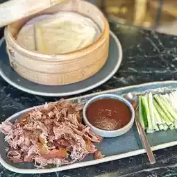 The main course was crispy duck, which is almost the same as the usual Peking duck, but the duck meat is made into thin strips, then wrapped in hot grilled pizza with duck meat strips, cucumber strips, spring onions and special sweet sauce to eat together