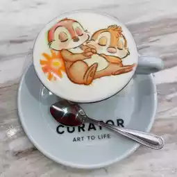 This time I chose my favorite Chip & Dale pattern for the barista, chose their own frozen chocolate base, and then used an art printing coffee machine to print the doll onto the thick and smooth cream foam.