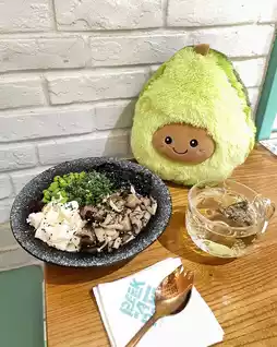 The bowl is much bigger than I expected. Later I found out there is a mini version. If girls want to eat, a smaller bowl might be more suitable. You can choose rice or salad below. The salads here are not just romaine lettuce, there are several different shades of dark and light green salads, which I think are quite good. Several ingredients, such as tofu, edamame and mushrooms, are proteins. The mushrooms are cut into large, juicy pieces that are easy to chew. The most special thing is that they are tied with kelp, which has a layered texture when chewed. The dish is also rich in trace nutrients and is very suitable for vegetarians.