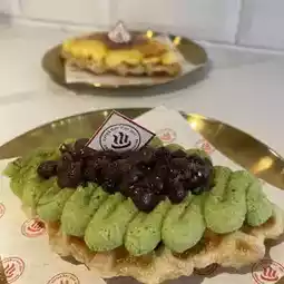 The waffles are crispy, rich in matcha flavor, and perfect match with red beans!