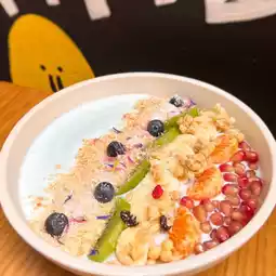 The light blue yogurt is made of a variety of fruits, namely kiwi, blueberry, banana, mandarin orange, and pomegranate seeds. Each fruit is fresh and juicy. Eat it with cereals and crispy rice. It adds a taste and is very healthy🥰