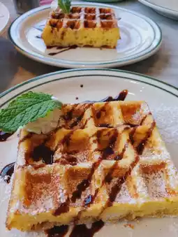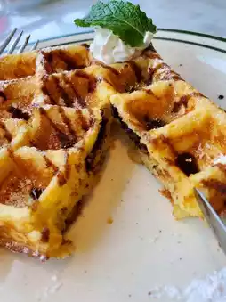 This set of waffles is different from the above set, except that the face is chocolate sauce and cream as well, this waffle is half chocolate filled