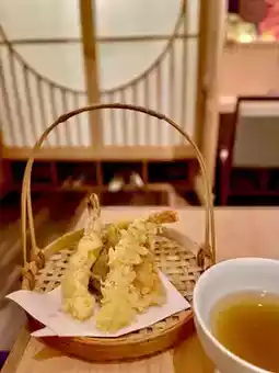 The tempura platter includes two fried shrimp 🦐 pumpkin 🎃 sweet potatoes 🍠 and mushrooms 🍄