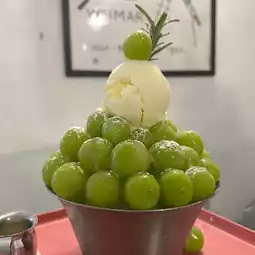 Underneath the overflowing Shine Muscat grapes is a layer of smooth milk ice, which is even more delicious when you pour the condensed milk on the side😊