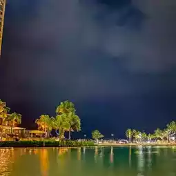 There are a lot of people gathered around the Hilton Lagoon before it starts,