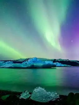 - Jökulsárlón Glacier Lagoon: A surreal scene where auroras dance above floating icebergs.