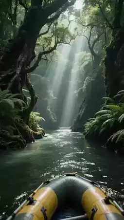 ✔️ Vines hang low on both banks, within arm’s reach, like a jungle adventure movie scene