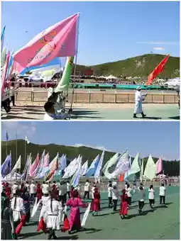 One by one, distinctive formations enter the venue. Mongolian riders on beautifully decorated horses, holding colorful flags, draw everyone's attention, adding a sense of solemnity and sanctity to the feast.
