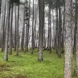 Green pine forest with a herd of buffalo walking to graze in the middle of the pine forest