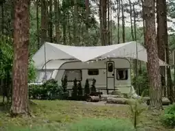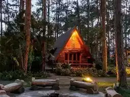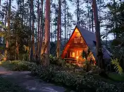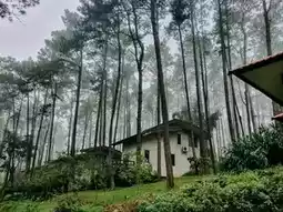 A very romantic accommodation in the middle of a pine forest, covered in light mist