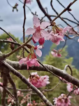 On a spring morning, I traveled along the winding mountain road to Smangus in Hsinchu, a village hidden among the mountains. At this moment, the village is transformed into a pink fairyland by the cherry blossoms covering the hills. A gentle breeze blows as I stroll along the mountain paths, where pale pink Yoshino cherry blossoms and deep red mountain cherry blossoms bloom in a beautiful contrast. Against the backdrop of the blue sky and mist, the scene is even more serene and dreamlike. As I walk, the cherry blossoms dance lightly in the wind, their petals slowly falling to form a soft pink carpet, making every step poetic. The distant sound of a babbling brook and the chirping of birds in the forest create a symphony of spring. Travelers stop to admire the view, some chatting softly, others quietly soaking in the spirit of the mountains. I reach the observation deck and gaze at the layers of cherry blossoms among the mountains, with white clouds occasionally drifting over the peaks, like a moving painting. In the afternoon, the mist begins to rise, and the sea of pale pink flowers appears and disappears in the fog, creating an ethereal and dreamlike scene. The sunset casts a warm golden glow on the cherry blossoms. I stand there for a long time, deeply imprinting this cherry blossom paradise, far from the hustle and bustle, in my heart, filled with the tranquility and emotion of spring.