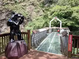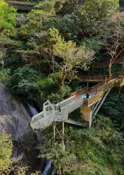 The Transparent Skywalk in Jianshi Township, Hsinchu, stands against a backdrop of blue sky and white clouds, resembling a crystal bridge suspended in mid-air. Beneath the clear valley and layers of greenery, you can feel the gentle breeze and gaze directly down upon the magnificent waterfall below. The splashing water against the rock face sparkles with sunlight, like scattered diamonds.