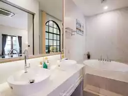 As for the bathroom, it comes with a large jacuzzi tub for you to lie down and soak yourself in. The more you can lie down and soak with your lover, the more romantic it is. 💓