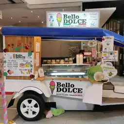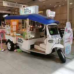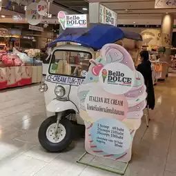 We walked to the G floor and saw this cream-colored tuk-tuk. We walked closer and saw that it was Bello DOLCE Icecream, an Italian homemade ice cream shop. The ice cream here has many flavors, bright colors, and looks delicious. It's perfect for the hot weather right now.