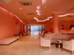 The room is decorated in pink tones with complete facilities