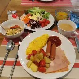 🍳 Breakfast here is a buffet. There is a variety of breakfasts, both American style, omelets, fried eggs, sausages, ham, various types of bread, fresh vegetable salads, various dressings.