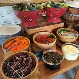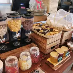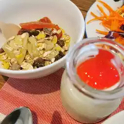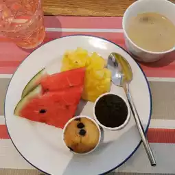 🧁 Desserts include oat muffins, chocolate muffins, pancakes, yogurt, fresh fruit.