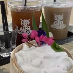 The location is in Pran Buri District, but not far from Hua Hin, it takes less than 15 minutes to travel there. When you arrive, you can park your car in front of the shop. There is a parking lot for about one hour. Walking to the front, you will see the shop decorated with a picnic-like feel by the sea. The seats and props are arranged perfectly. There are plenty of photo spots, including swings, nets, tables, chairs, and the highlight is the tent with black and white flags flying in the sky. It gives a full on-the-beach vibe.