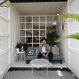 The shop is a black container decorated in a cool minimalist style. This area is all outdoor, but it is shaded by coconut trees and trees. There is a roof to protect from the sun, where you can sit and relax. The indoor seating area inside the container is open-air, receiving natural wind. Around the container, there is also a cool net corner hidden.