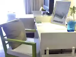 But even the most ordinary floor rooms come with spacious terraces with ocean views. The room is mainly clean white with wooden floors, green wooden chairs, blue lampshades, pillows on the lounge chairs add a warm color to the room, giving people a feeling of relaxation; 👍🏼🍌🍎🍰🥪🧁☕️