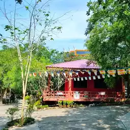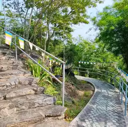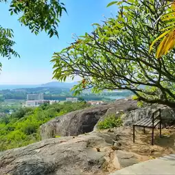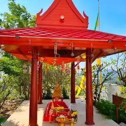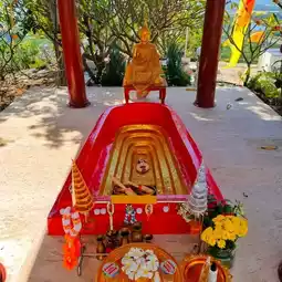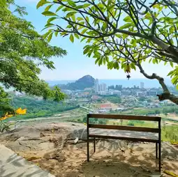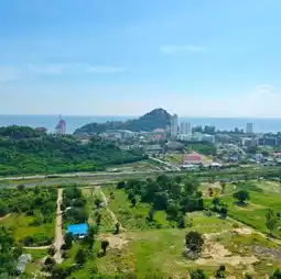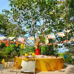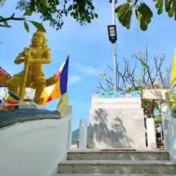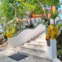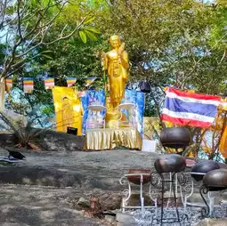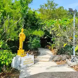 Khao Sanam Chai Temple is near the city of Hua Hin. The church is where you can pay homage to the principal Buddha image. The other side is the chedi. Park your car and walk up the hill for 200-300 meters. The chedi is beautiful and you can see the city of Hua Hin. There are footprints for you to pay homage to. Behind it is a viewpoint worth millions. You can see Wat Krailas, Wat Khao Lan Thom, Wat Khao Takiab, and the highlight, the cliff you can see, Suan Son Golf Course, Koh Singto.
